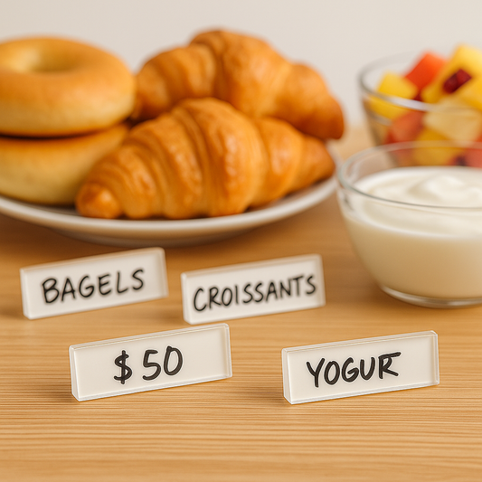İsim ve etiket standları; yaz-çiz, güncellenebilir yapılarıyla pastane, açık büfe, kafe ve restoranlarda pratik kullanım sunar. Farklı malzeme ve renk seçenekleri sayesinde her konsepte uyum sağlar, kolay değiştirilebilir içerikleriyle hızlı ve düzenli bir sunum imkânı sağlar.