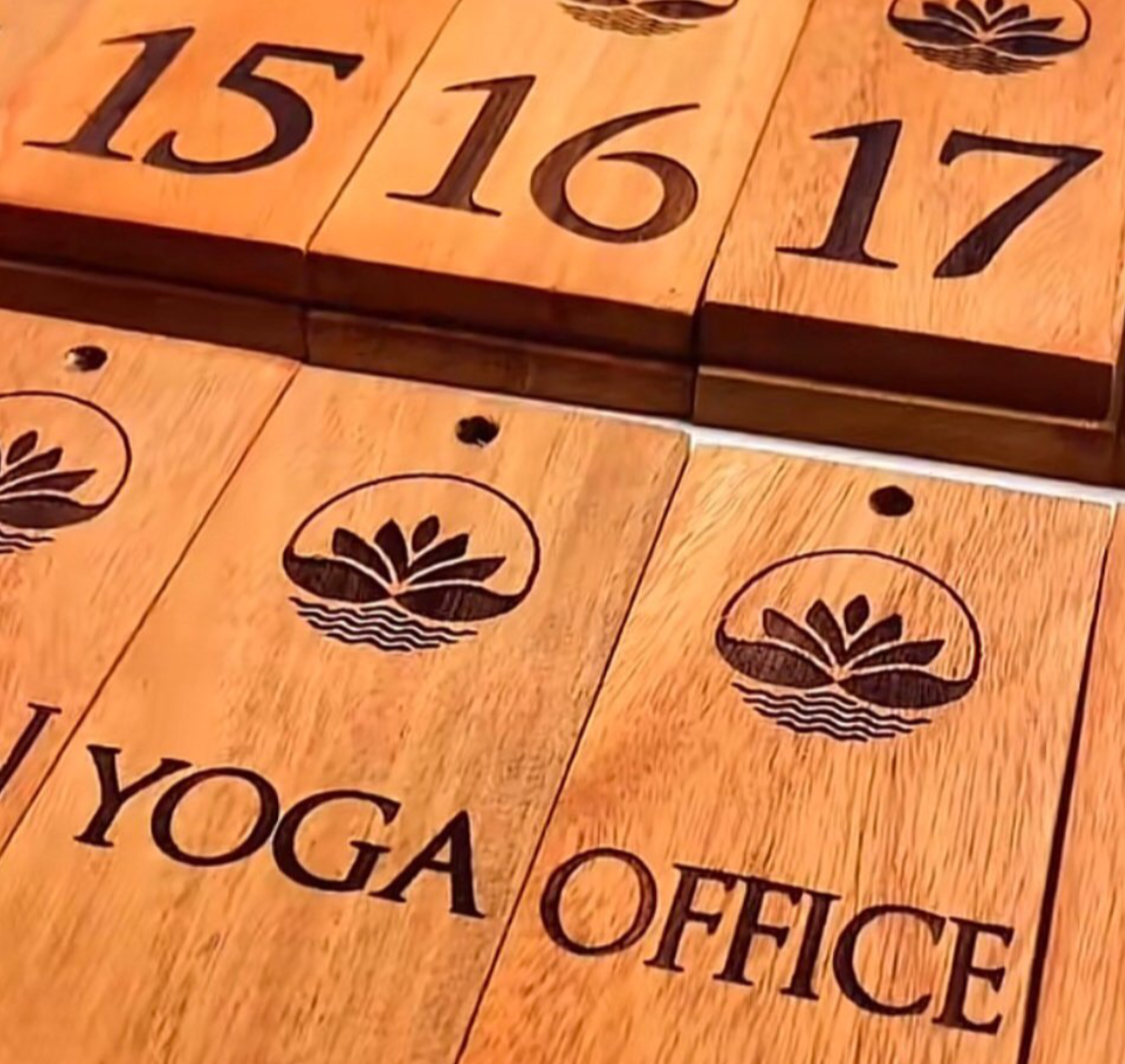 We can add text to this wooden keychain using laser cutting.