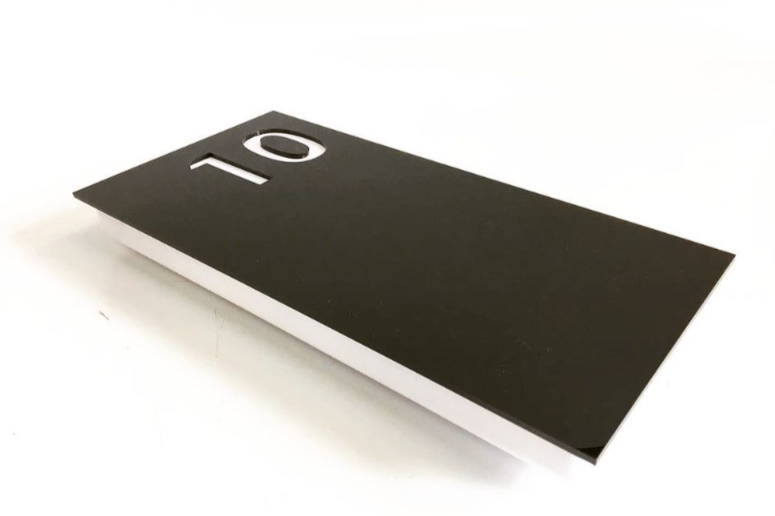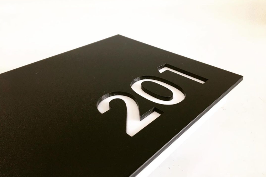 LED-illuminated acrylic door number. This room number, which also serves to illuminate corridors, was manufactured using laser and pantograph techniques for the logo.