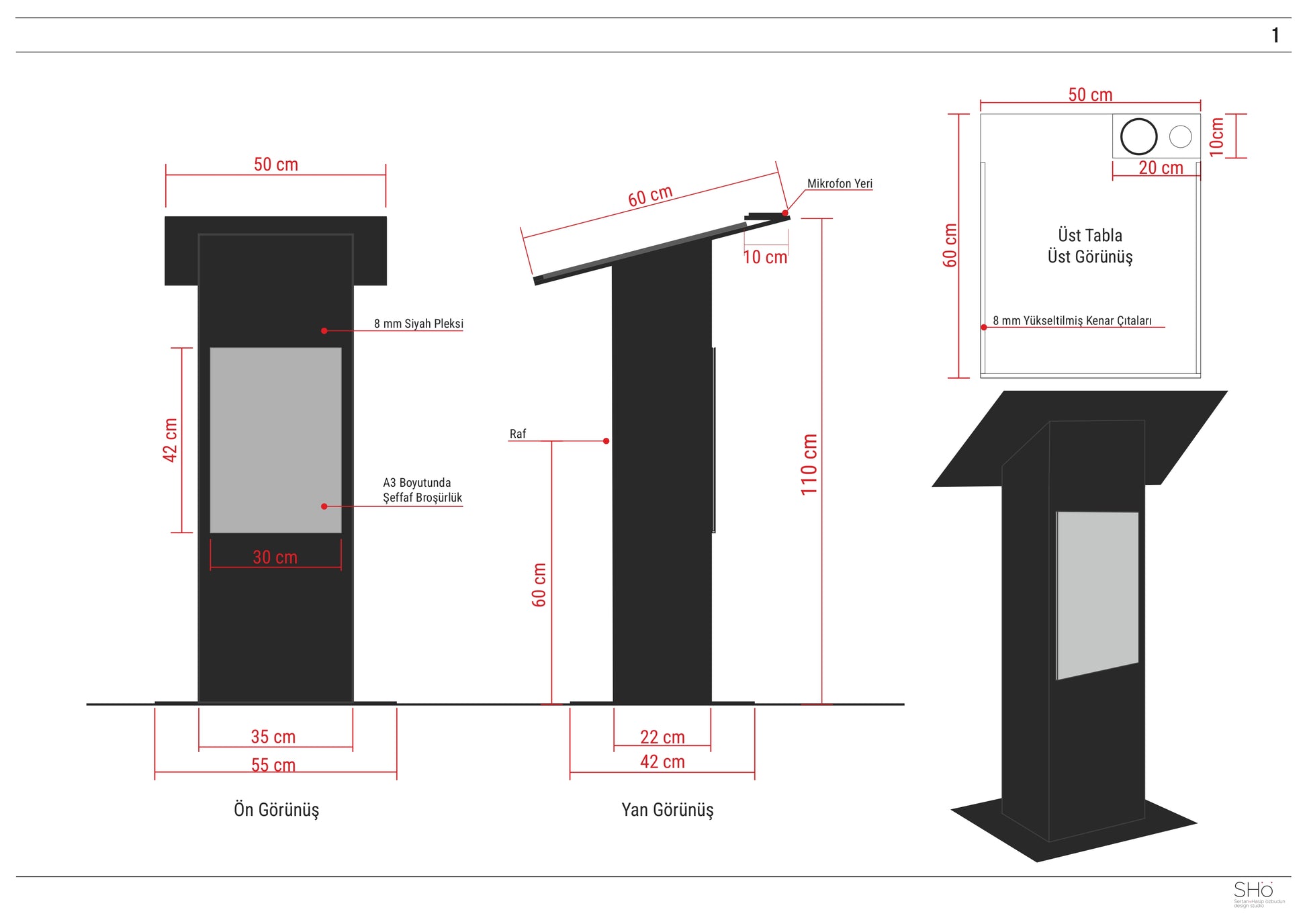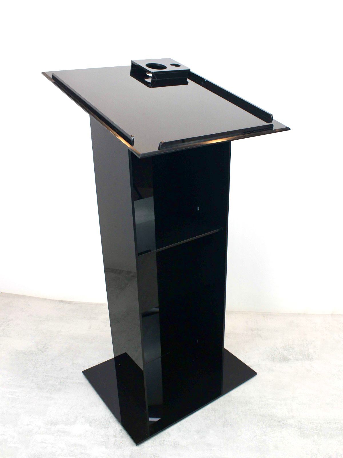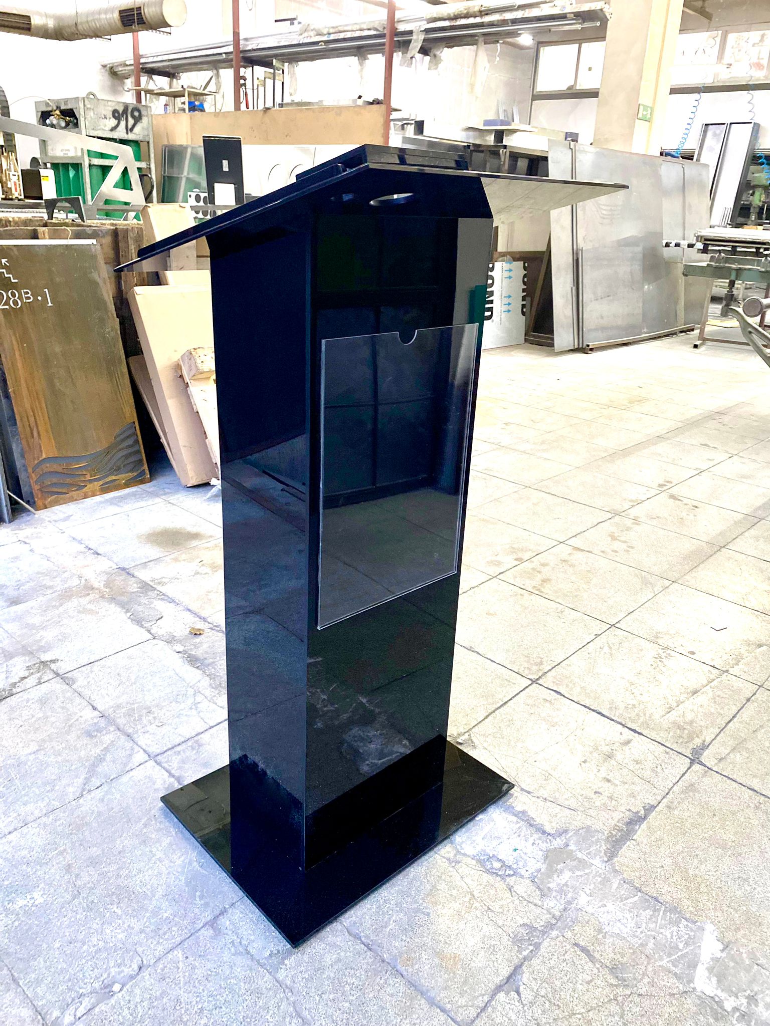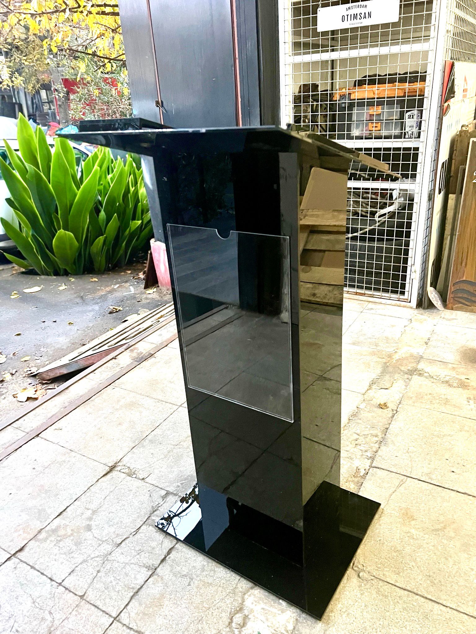 This product is a modern and stylish lectern made entirely of high-quality black plexiglass. Its special design offers both an aesthetically pleasing appearance and functional use. The front surface of the lectern features a space for displaying A3-sized brochures or documents. This feature makes it easier to present information to participants, especially during presentations, seminars, or meetings.