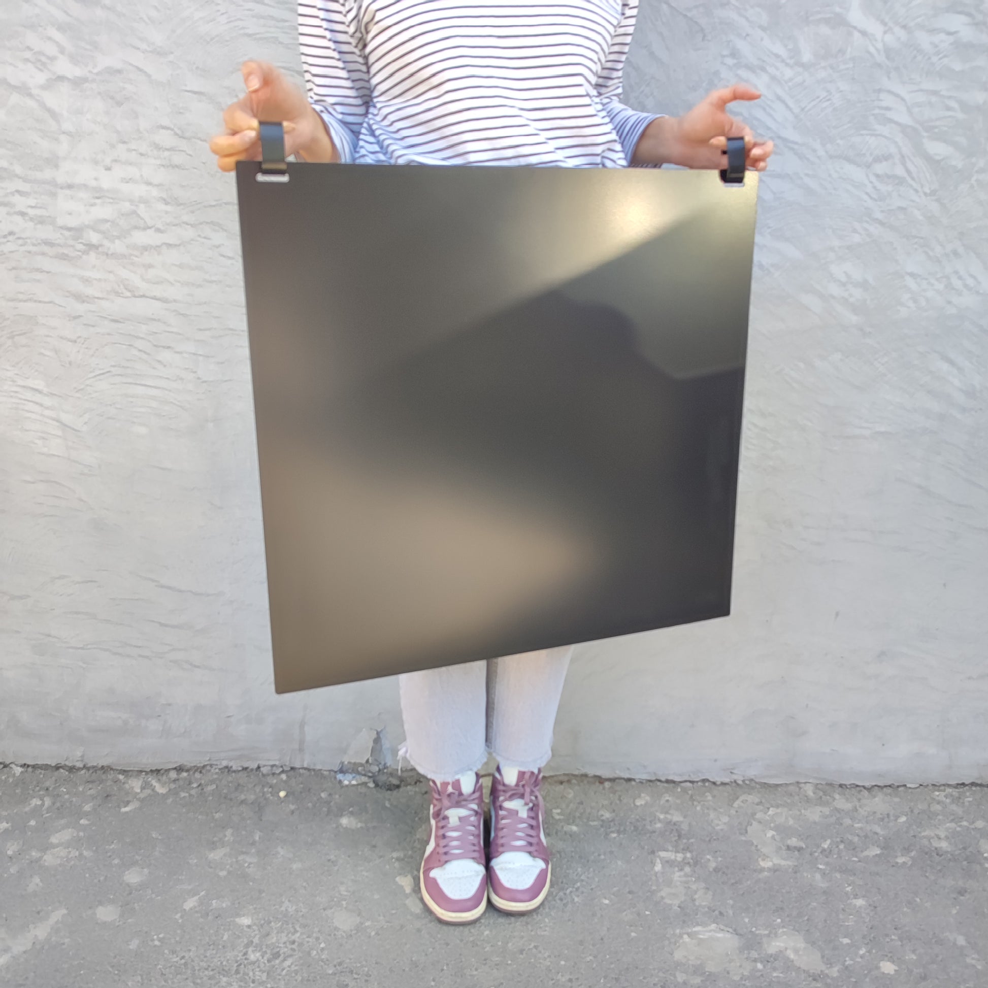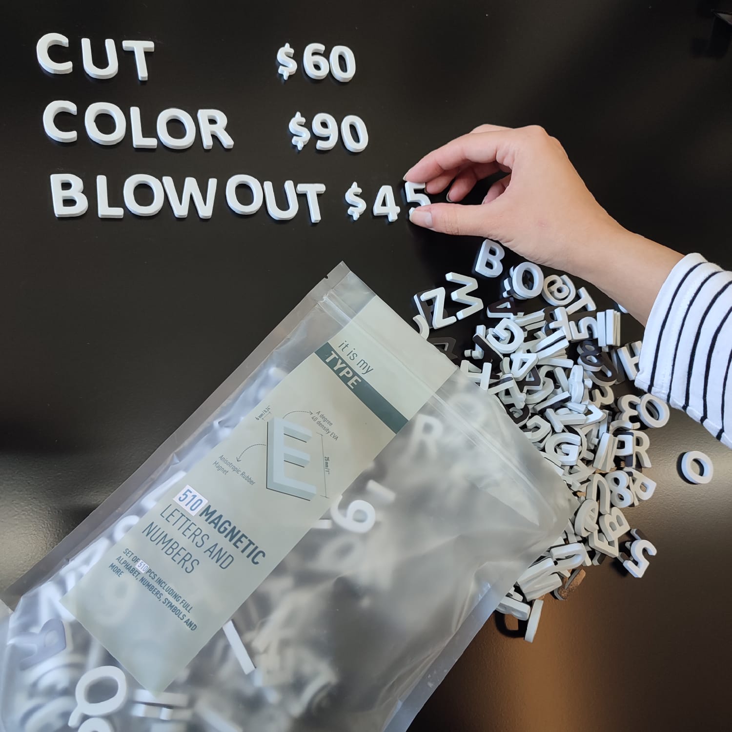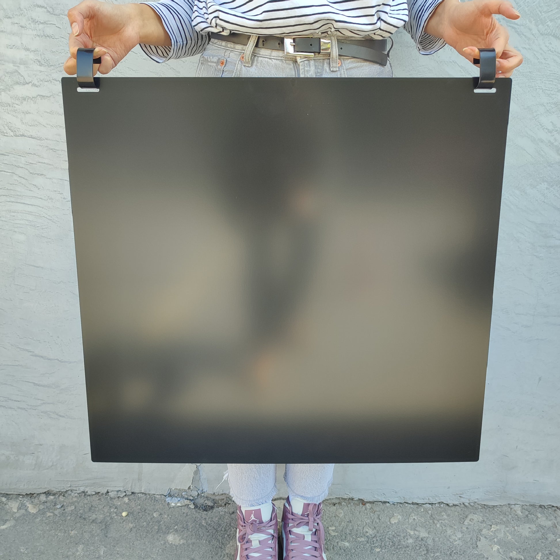 The product includes 2 packs of magnetic letters + 3 black painted 66x62 cm sheet metal plates.