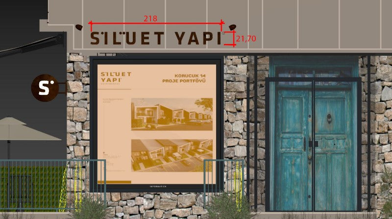 The product consists of individual letters measuring 21 x 218 cm, made from 2 mm thick corten steel, with pins attached to the back.