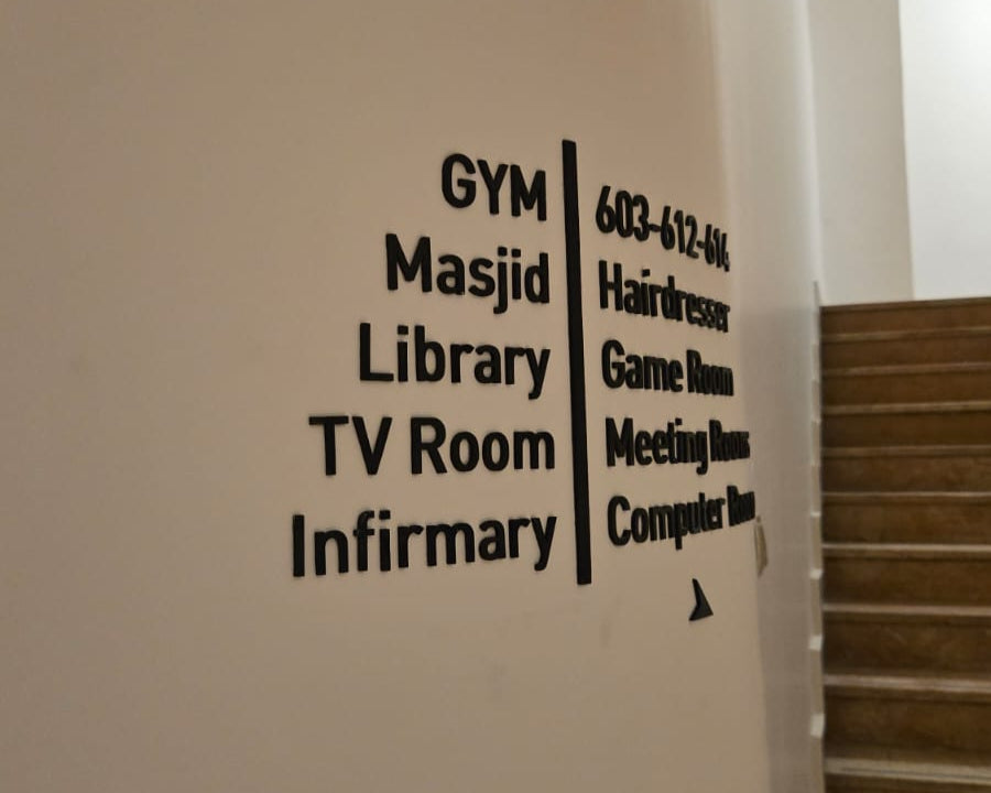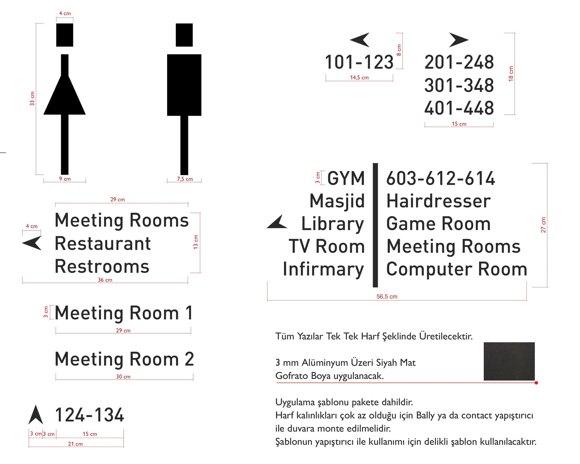 Custom-made Conrad-type 3mm aluminum with bronze paint, individual letters (3cm in size), arrows, and symbols.