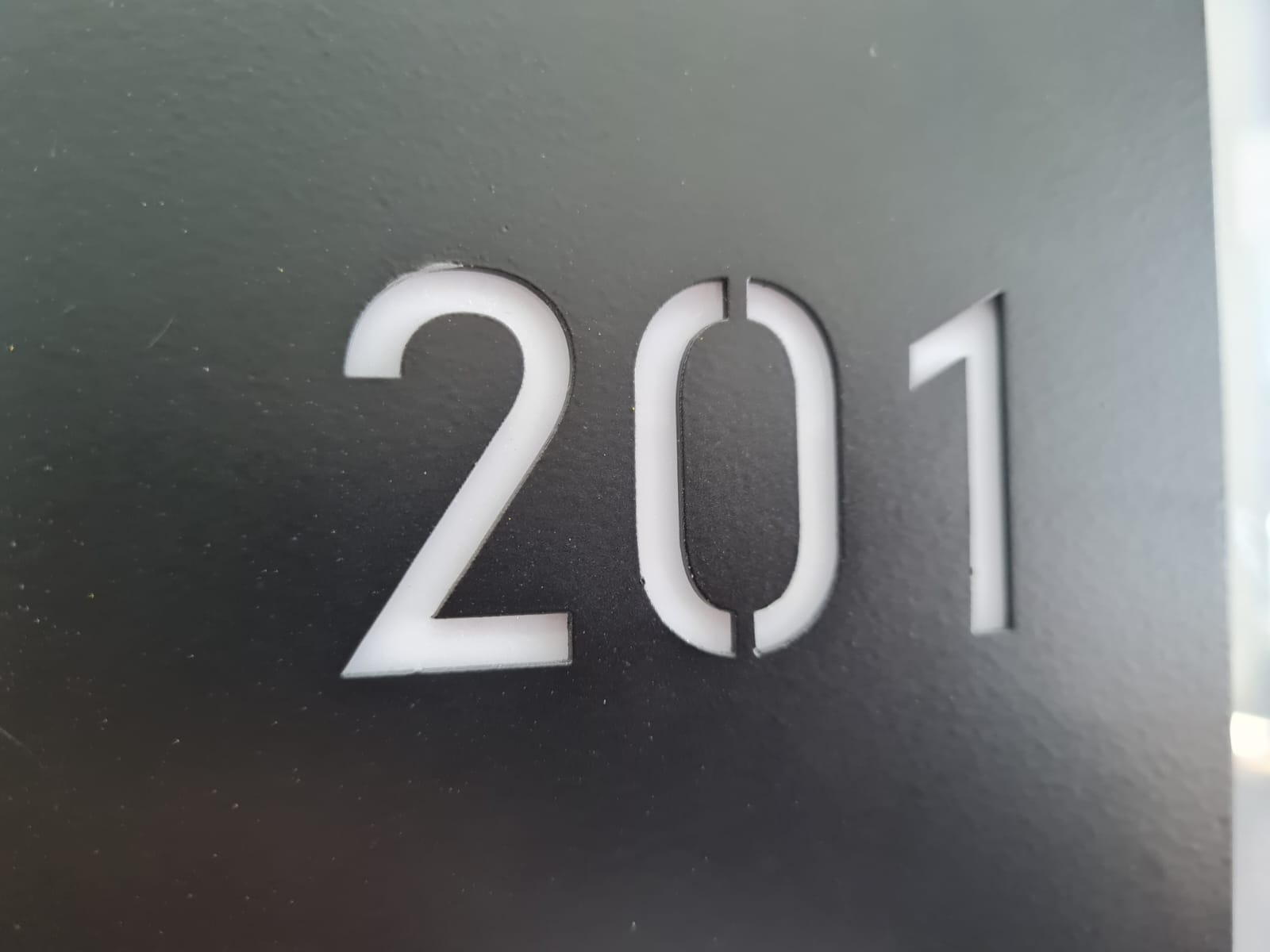 9 pieces of 10x30 cm, 3 mm white acrylic with 2 mm black painted aluminum. Aluminum door nameplate with cutout design.