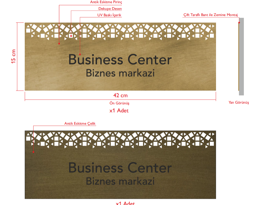 The product contents include one custom-made [sample 420x105 mm] directional sign made of antique-finish steel and one directional sign made of brass.
